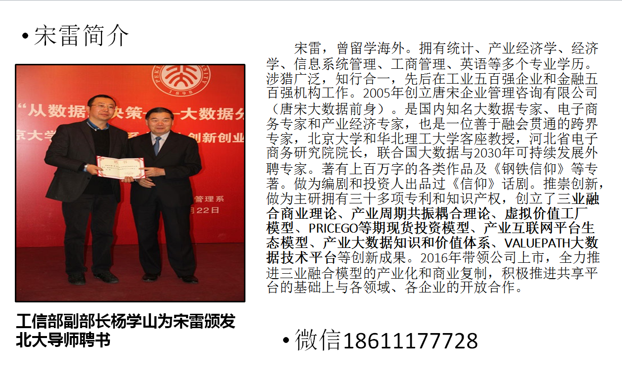 宋雷曾留学海外,有深厚的产业和金融背景。对互联网+和大数据+如何与产业融合有独到的研究。是中国产业大数据、电子商务领域实战型领军人才,开创"三业融合"理论,并致力于通过商业实践推动"数据=交易=金融"这一全新商业模式。首提在大数据时代实现"有市场的计划经济"理念。